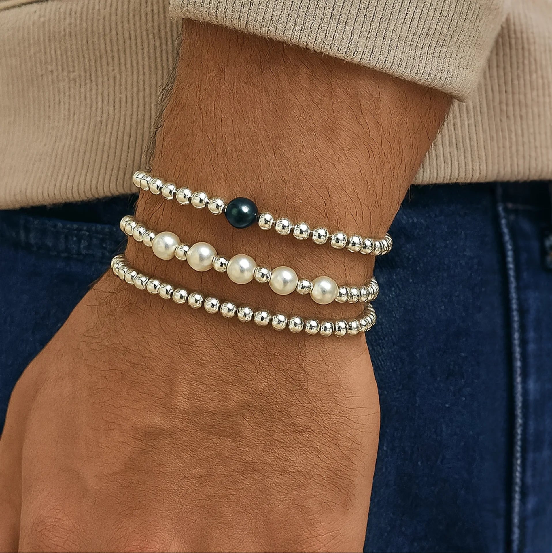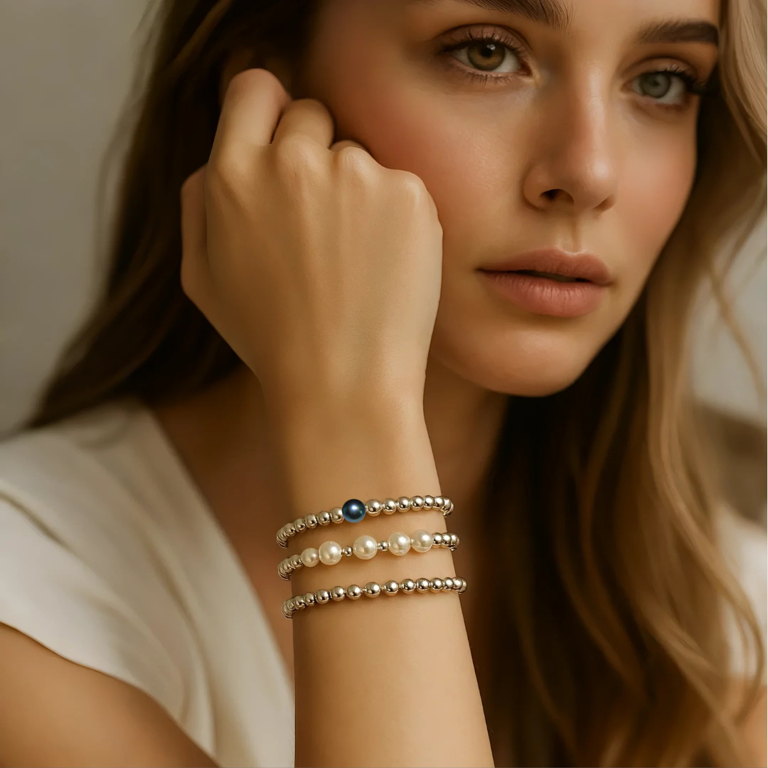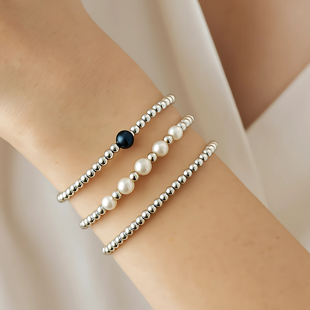 ثلاث أساور من اللؤلؤ الطبيعي الأبيض والأسود مع حبات من الهيماتايت الكندي الاصلي ، تمثل هذه القطعة مزيجًا مثاليًا من الجمال الكلاسيكي واللمسة العصرية. صُممت لتكون رمزًا للرفاهية والرقي، فهي لا تعكس فقط ذوقك الرفيع بل تضيف لمسة ساحرة إلى إطلالتك، كلما ارتديتها.