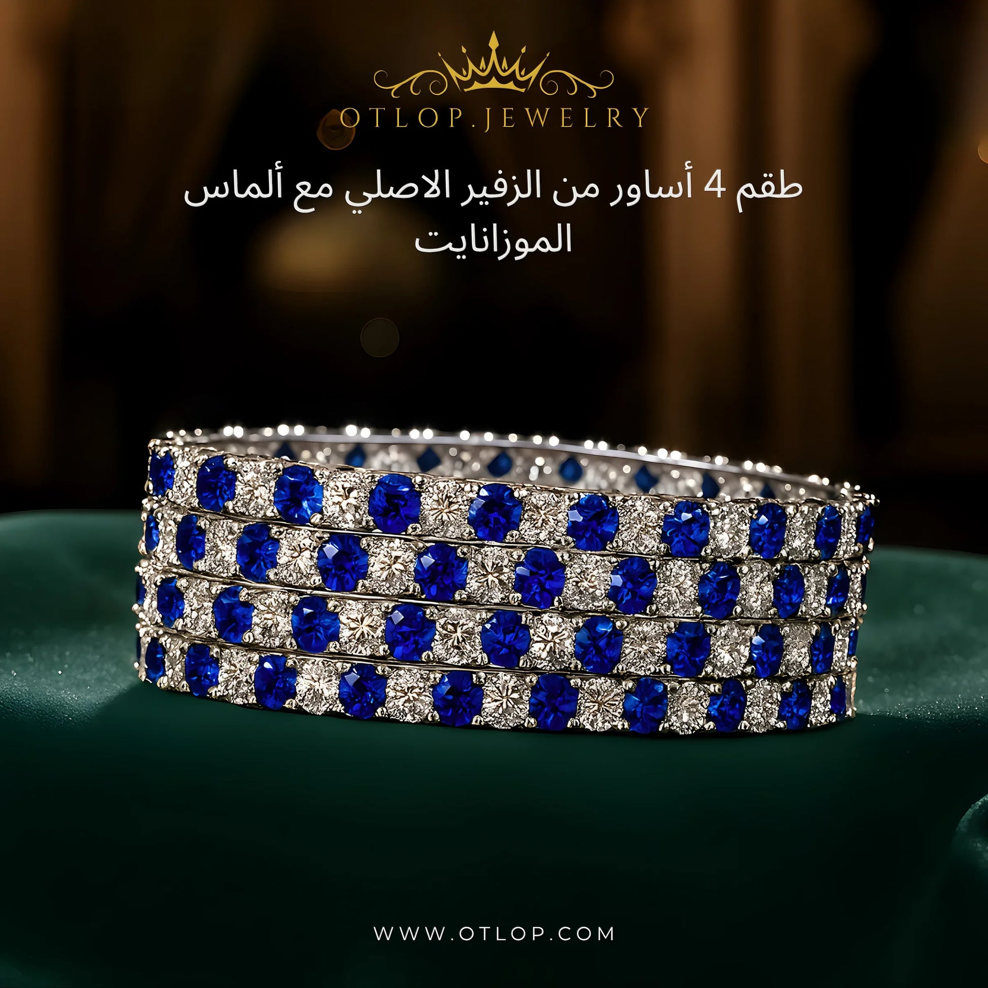 الأسورة 4 طبقات من الزفير الأصلي مع ألماس الموزانايت والمعدن من الفضه عيار 925 المطليه بالبلاتين
