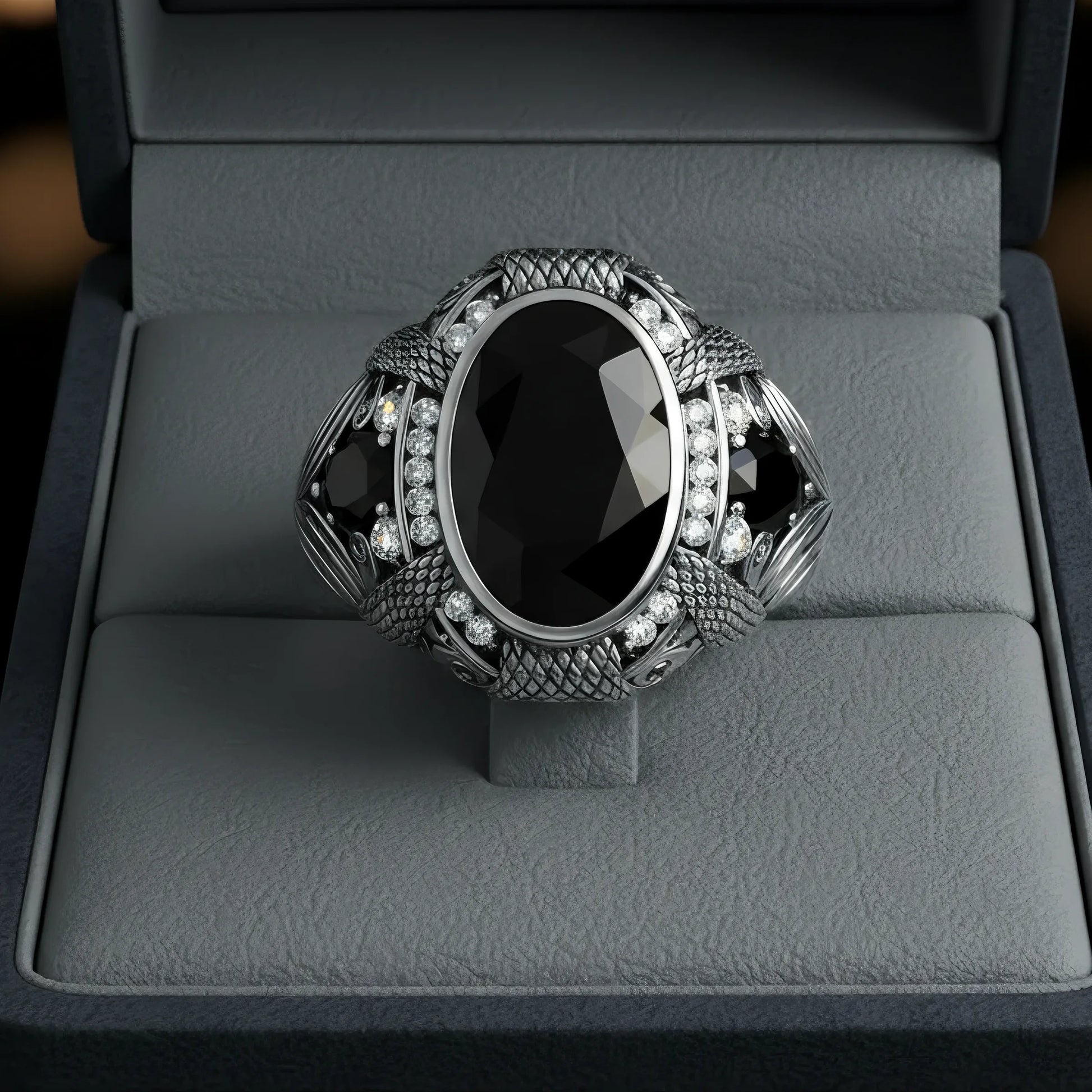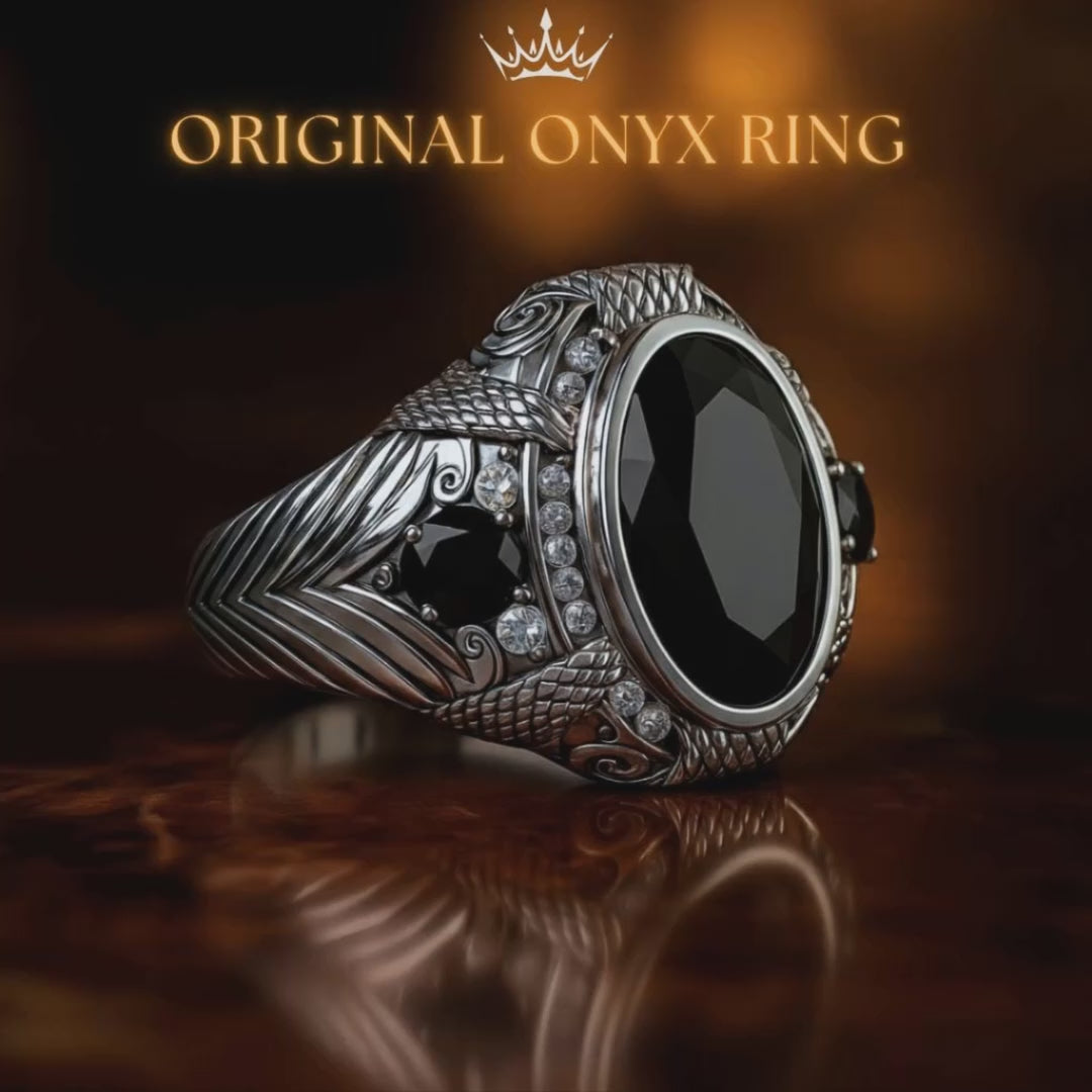 التصميم يدمج بين البريق الطاغي للألماس وقوة حضور العقيق.... حيث يتميز بحجر من عقيق الأونكس اللامع الطبيعي بيضاوي الشكل في المنتصف، ب ، و يُزين الجانبين أحجار عقيق أصغر ، و يُحيط بالحجر الرئيسي صف دائري من فصوص الألماس الموزانايت ببريقه المعروف