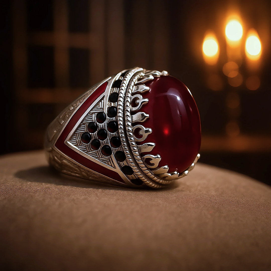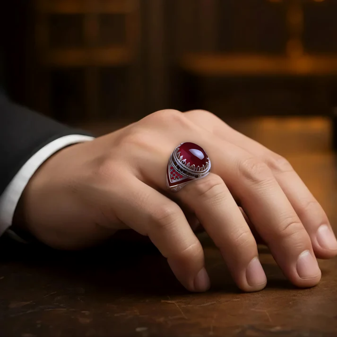 حين يستغرق الخاتم أكثر من 14 ساعة عمل .. وتنقش كل تفاصيله يدويا على جسم من الفضه الاسترليني المطليه بالذهب .. ثم يتم تتويجه بحجر من الياقوت الأصلي الطبيعي (مستخرج من المناجم وليس صناعي) .. ويرصع بأكثر من 30 حجر ياقوت طبيعي في الأجناب .. فحتما هو بذلك لا يناسب إلا صفوة الرجال