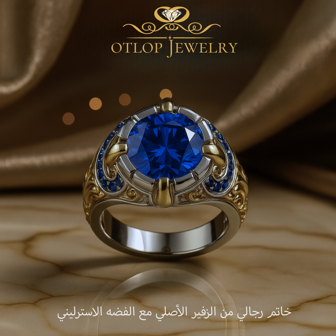 جسم الخاتم من الفضه الاسترليني المطليه بالذهب الأبيض مع أجزاء أخرى مطليه بالذهب الأصفر في تناغم رائع يزيد من قيمة وجمال الخاتم .. والحجر الرئيسي من الزفير الاصلي والتطعيم الجانبي يضم قرابة 20 حجر زفير