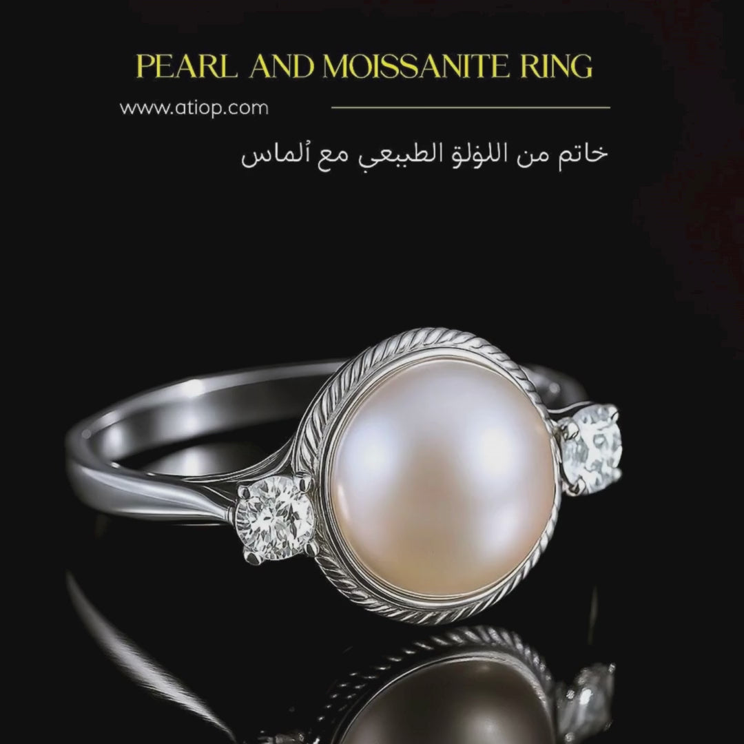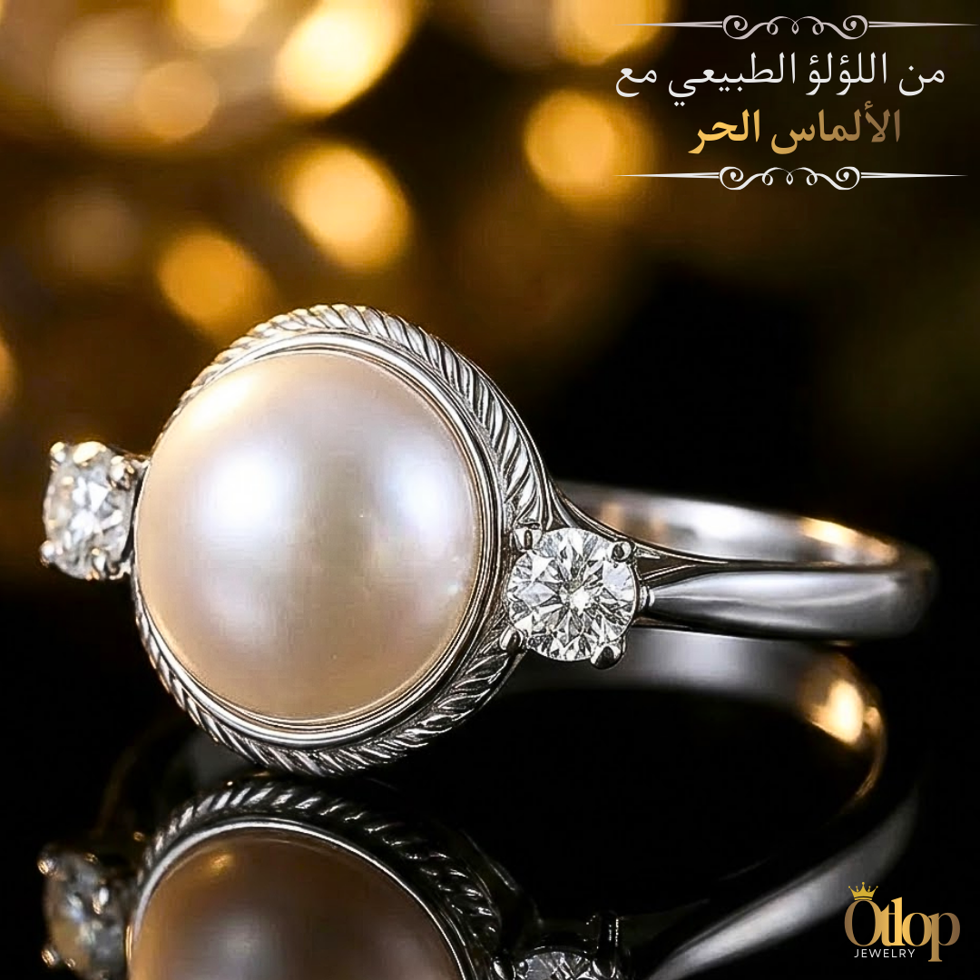 خاتم حريمي من اللؤلؤ الطبيعي الفاخر مع حجرين من الألماس الحر على جسم من الفضه المطليه بالبلاتين.
