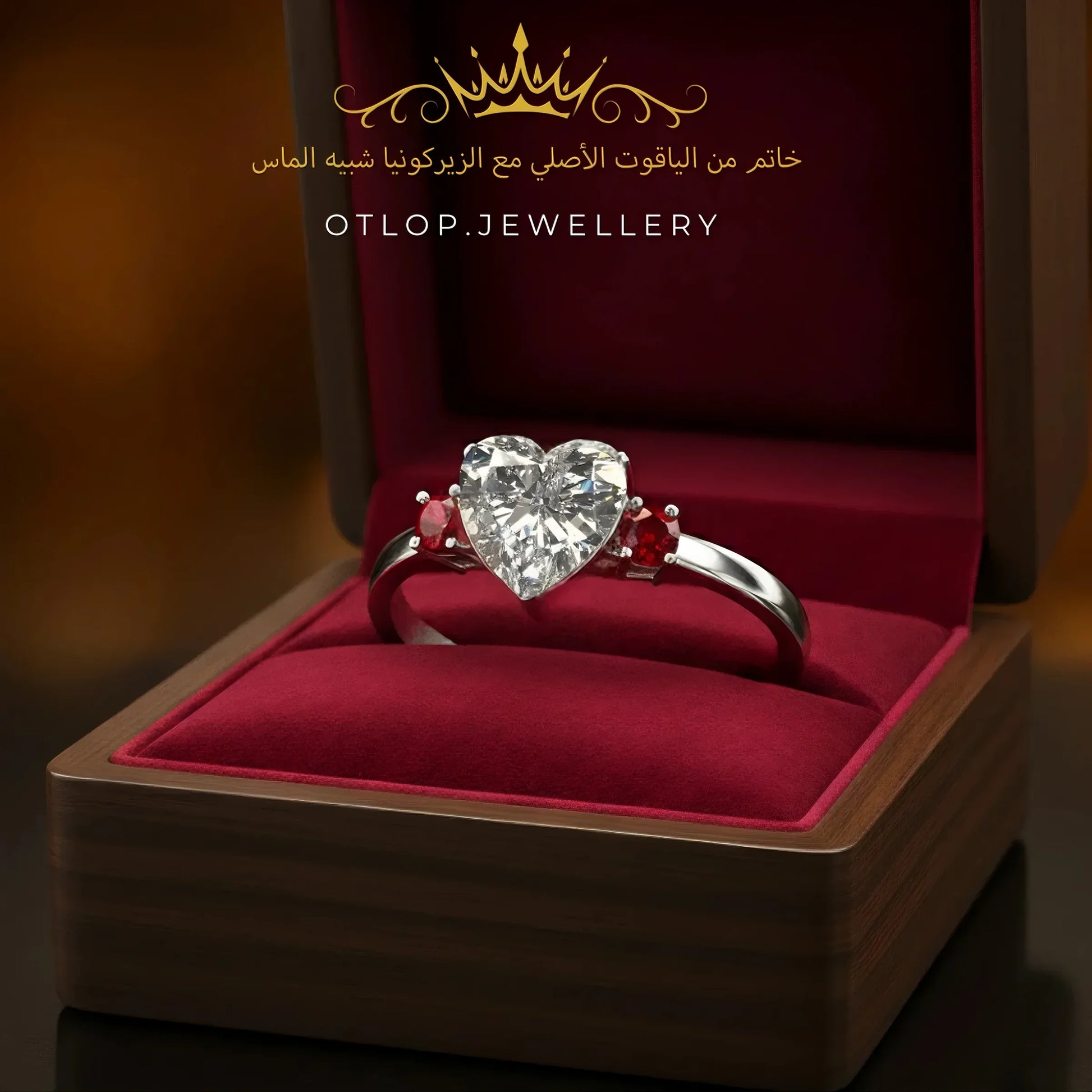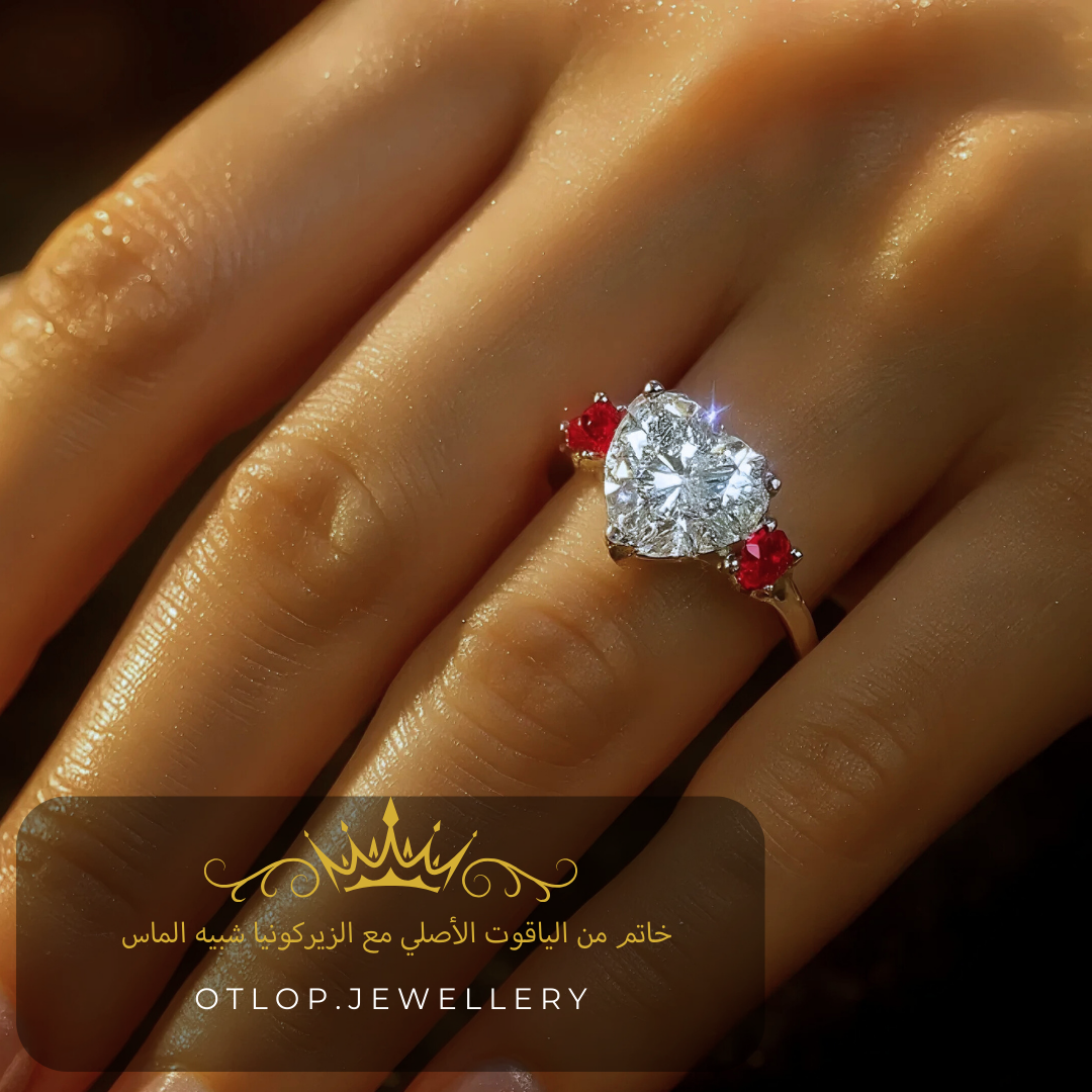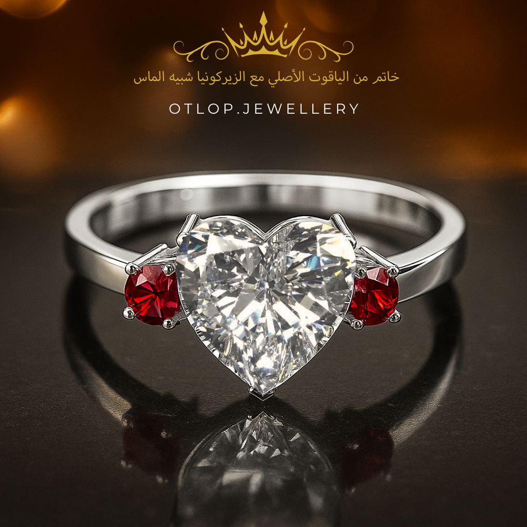 يتميّز الخاتم بحجر ماسي كبير يلفت الأنظار ويمنح الخاتم حضورًا مميزًا ، مع حجرين على الأجناب من الياقوت الأصلي فيمتزج مع الحجر الماسي بدون أي تشويش، ليمنحك قطعة تتحدث عن الفخامة دون حاجة لأي تعقيد. اختيار مثالي لعاشقات البساطة الراقية، حيث يتصدر الألماس المشهد بكل فخر وأناقة.