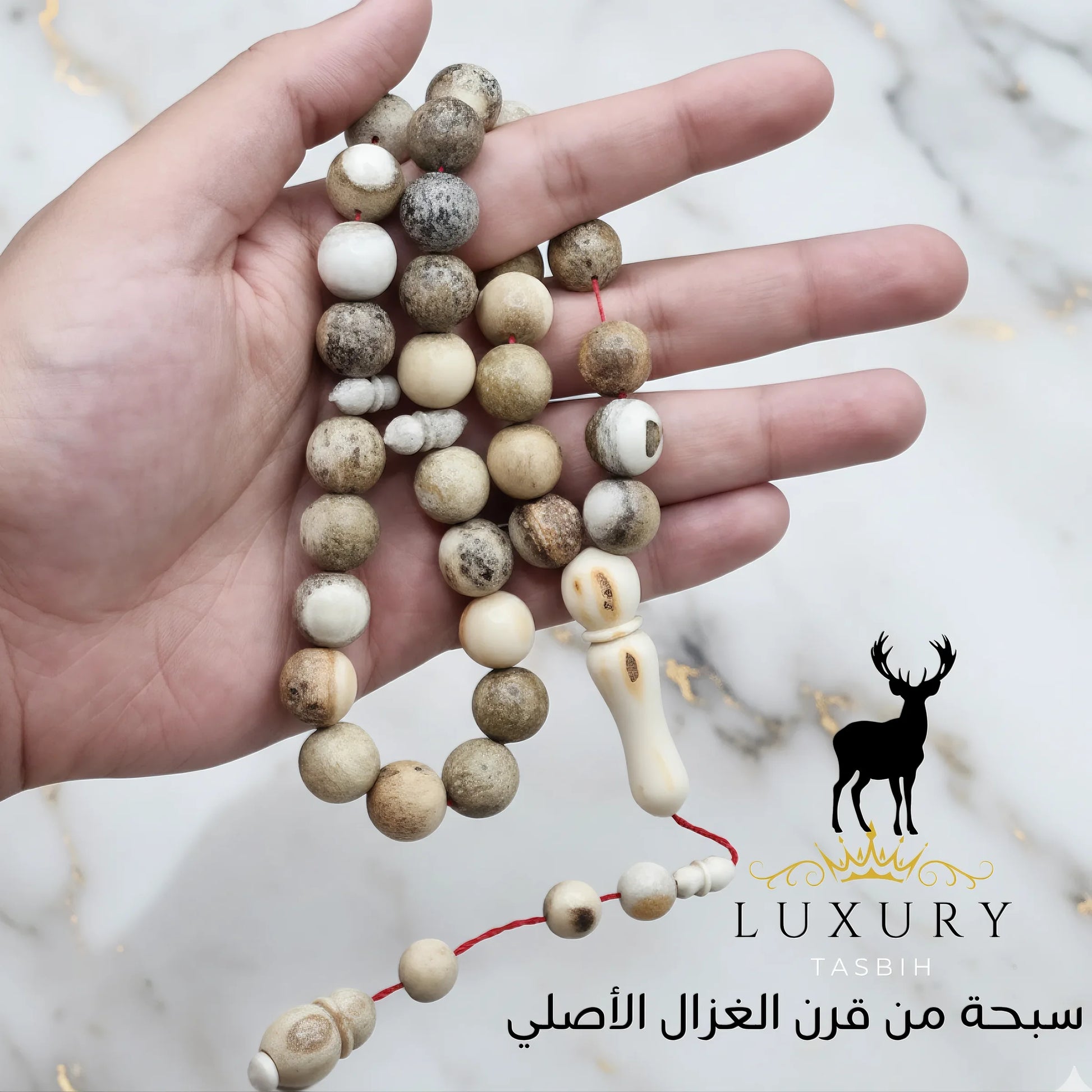 سبحة ملكية نادرة مصنوعة من قرن الغزال الطبيعي من فصيلة الأيل الأوروبي (European Deer)، أحد أرقى أنواع الغزلان في العالم وأكثرها فخامة.