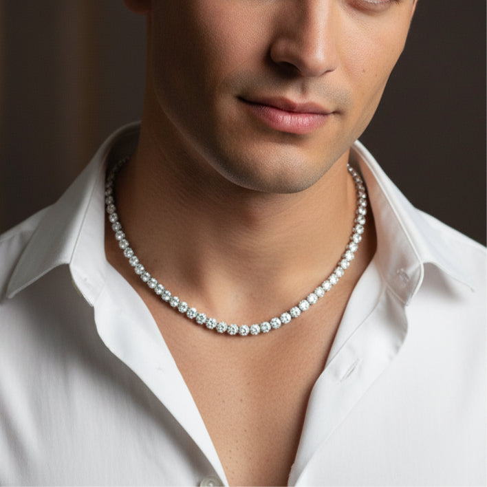 السلسله طولها 40 سم وتتكون من حبات من ألماس الموزانايت أو الكيوبك زيركونيا شبيه الماس. حجم كل حبه 5مم والسلسله على قاعده من الفضه عيار 925 المطليه بالذهب الأبيض.