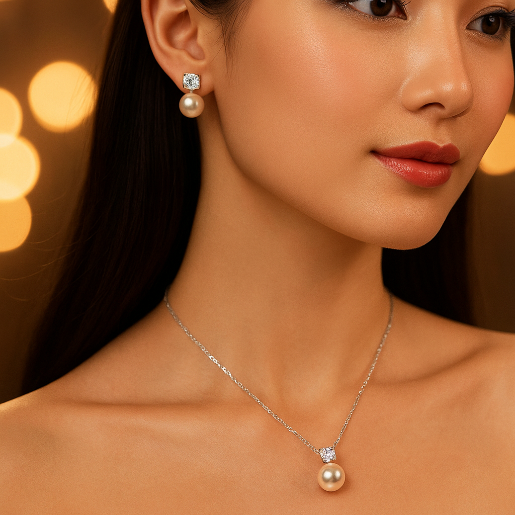طقم سلسلة و حلق من اللؤلؤ الطبيعي مع الألماس الحر - كود 821