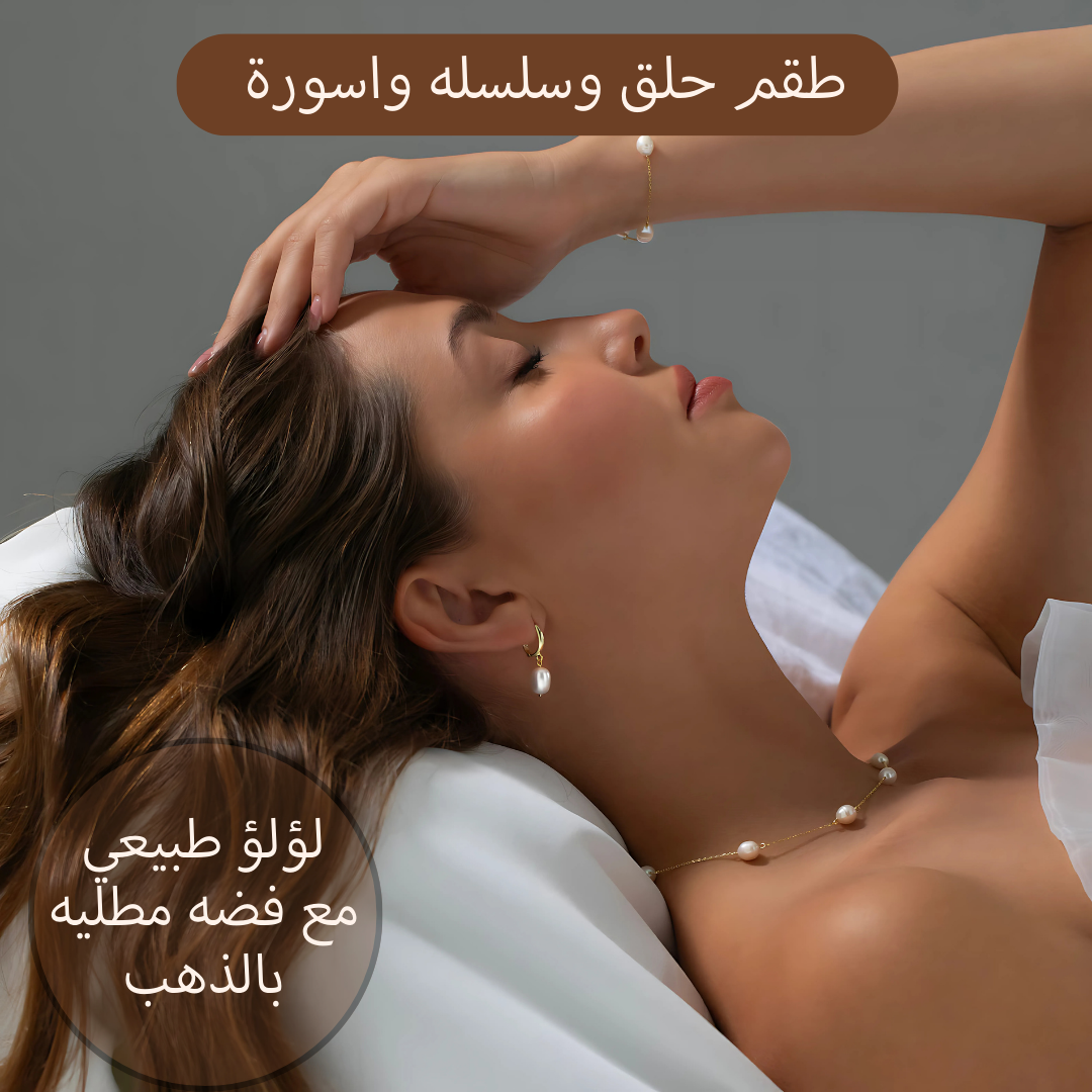 استمتعي بالفخامة و التفرد مع هذا الطقم الرائع الذي يجمع بين الأناقة الكلاسيكية والجمال العصري الطقم المكون من أسورة، حلق، وسلسلة من الفضة عيار 925 المطلية بالذهب، مزين بلؤلؤ freshwater pearl.