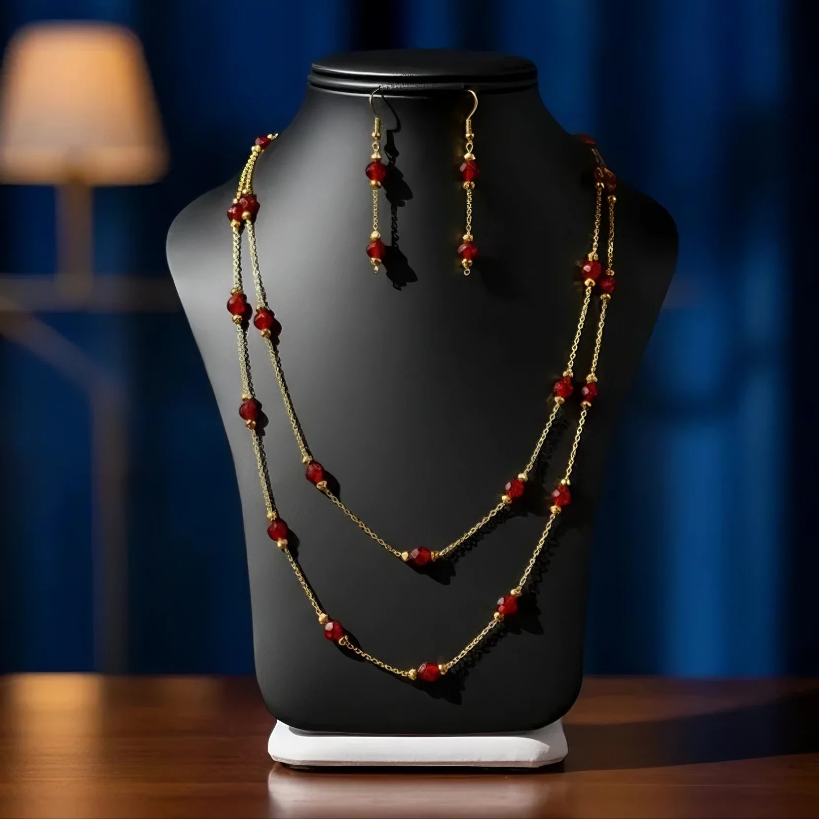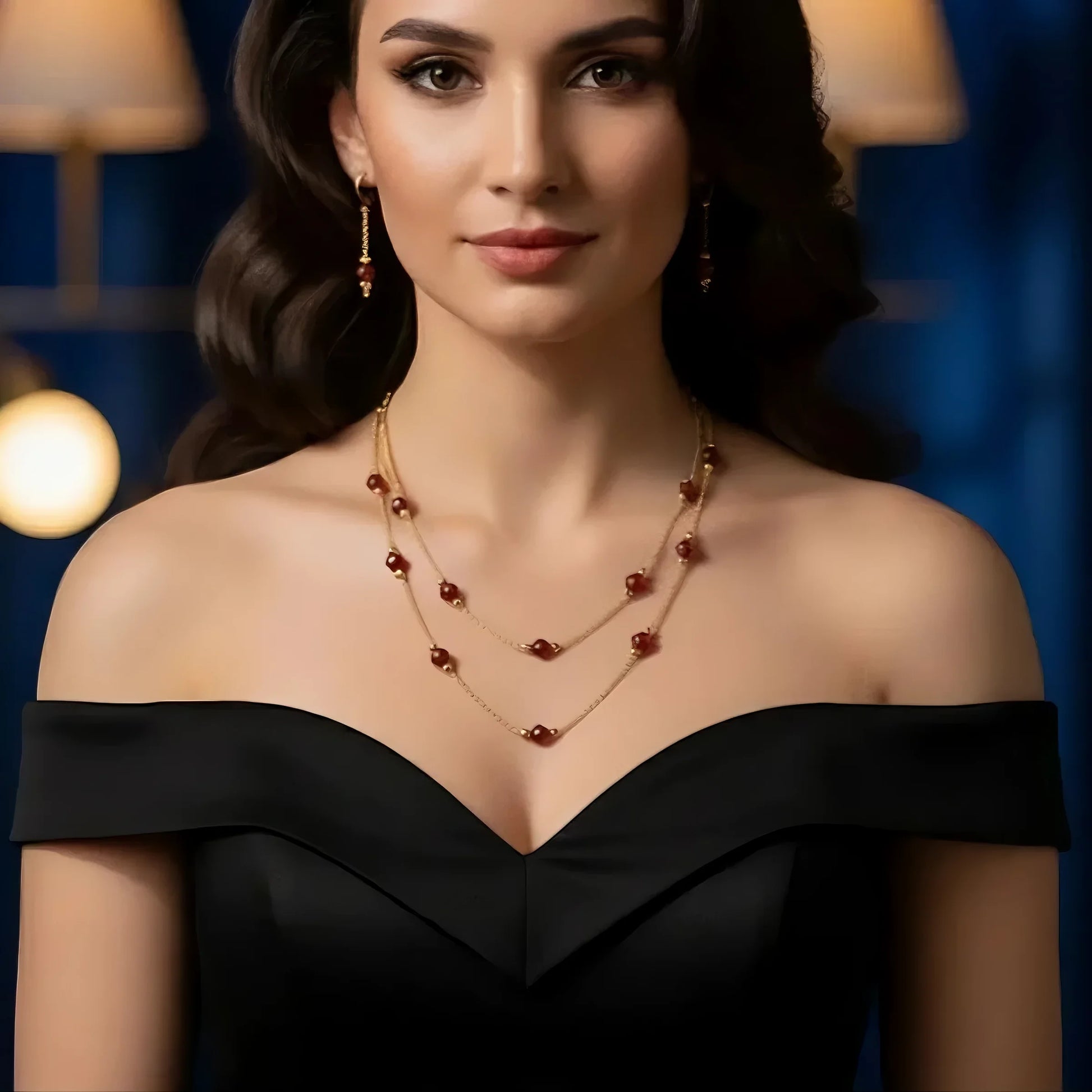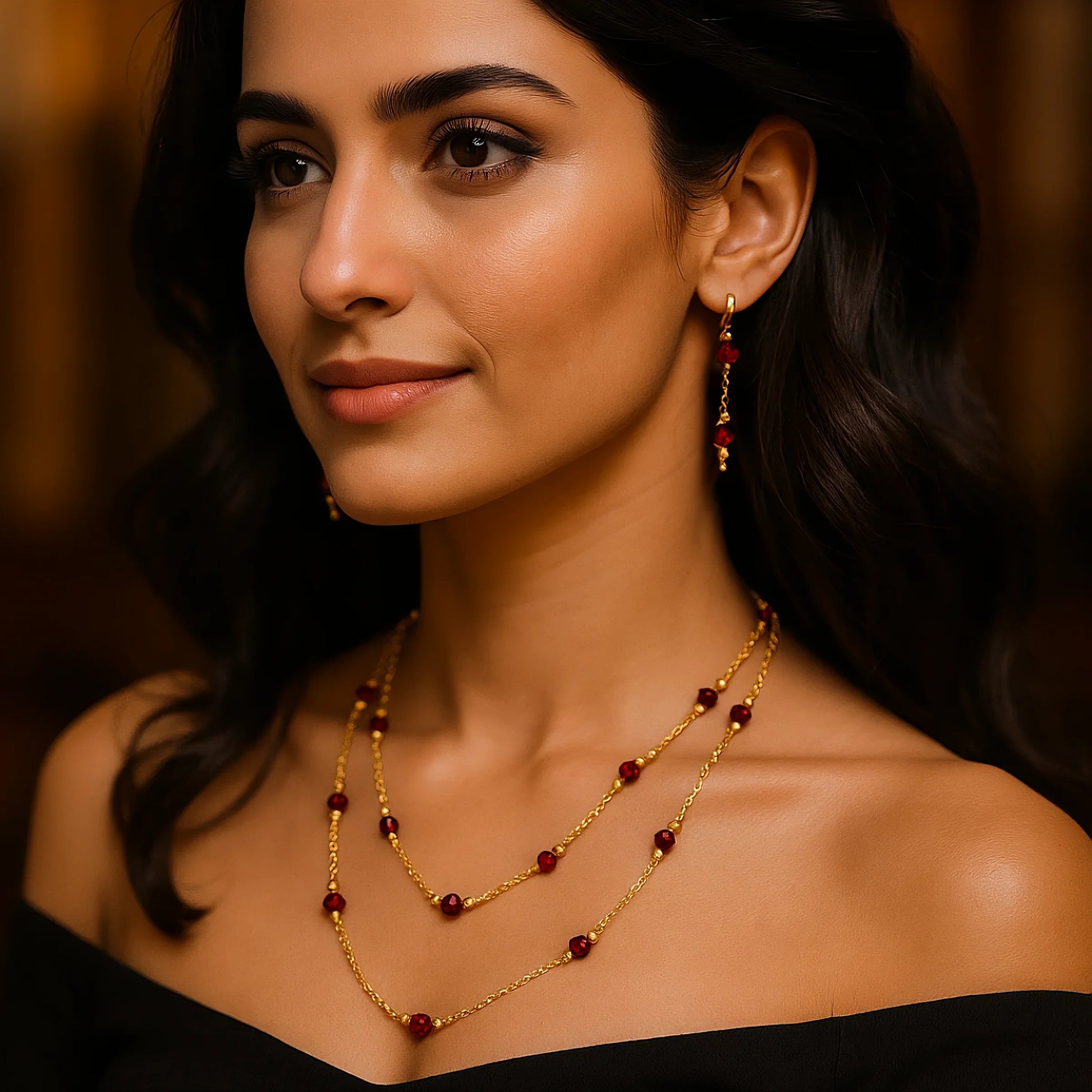 السلسلة عبارة عن طبقتين من الفضه عيار 925 المطليه بالذهب ، مزينة بحبيبات الجارنيت الأحمر الطبيعي بلونه العميق، يتكامل التصميم مع الحلق الناعم المرصع بنفس الحجر، ليضفي لمسة ملكية متألقة على إطلالتك.