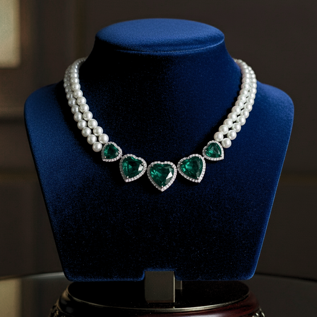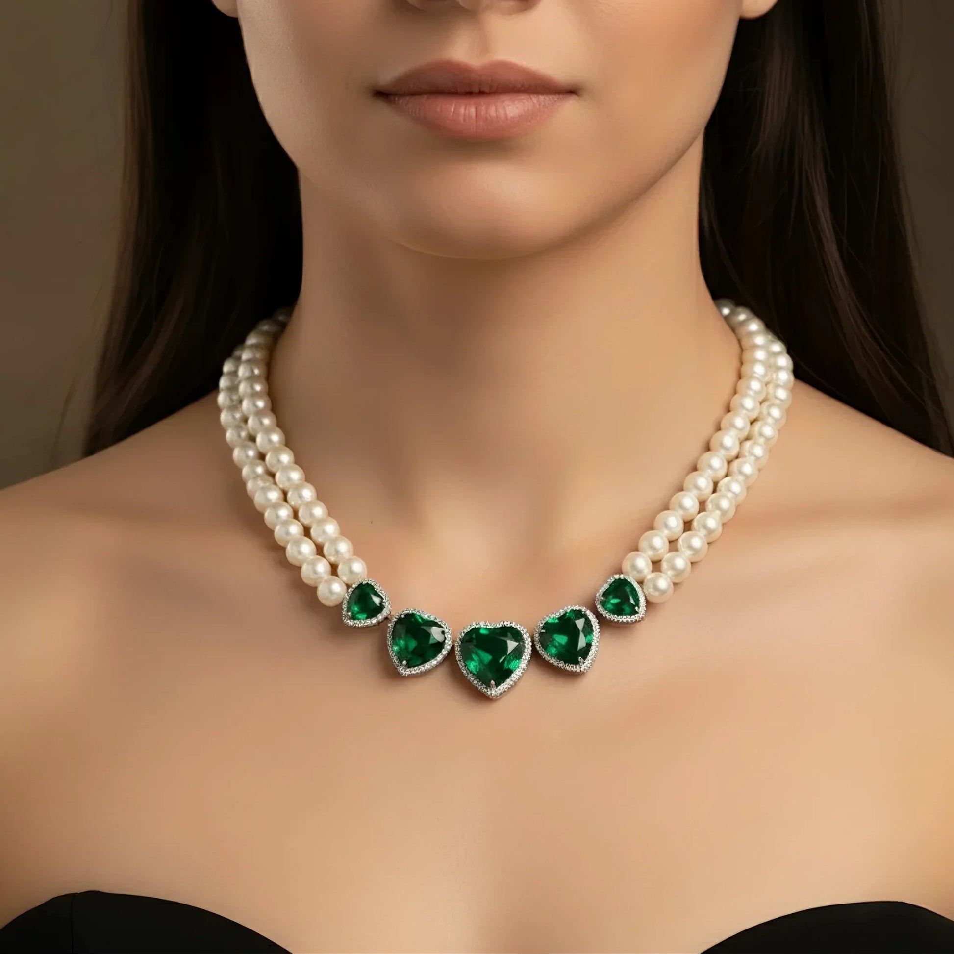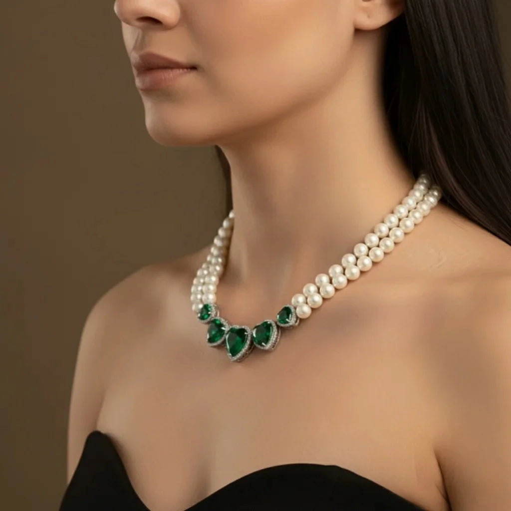 تحفة فنية تجمع بين اللؤلؤ الطبيعي أعلى درجه AAA .. مع 42 قيراط من الكيوبك زيركونيا الأصلي سبيه الزمرد مع ترصيع بألماس الموزانايت أو الألماس الحر (حسب الرغبه) على قاعده من الفضه عيار 925 المطليه بالبلاتين