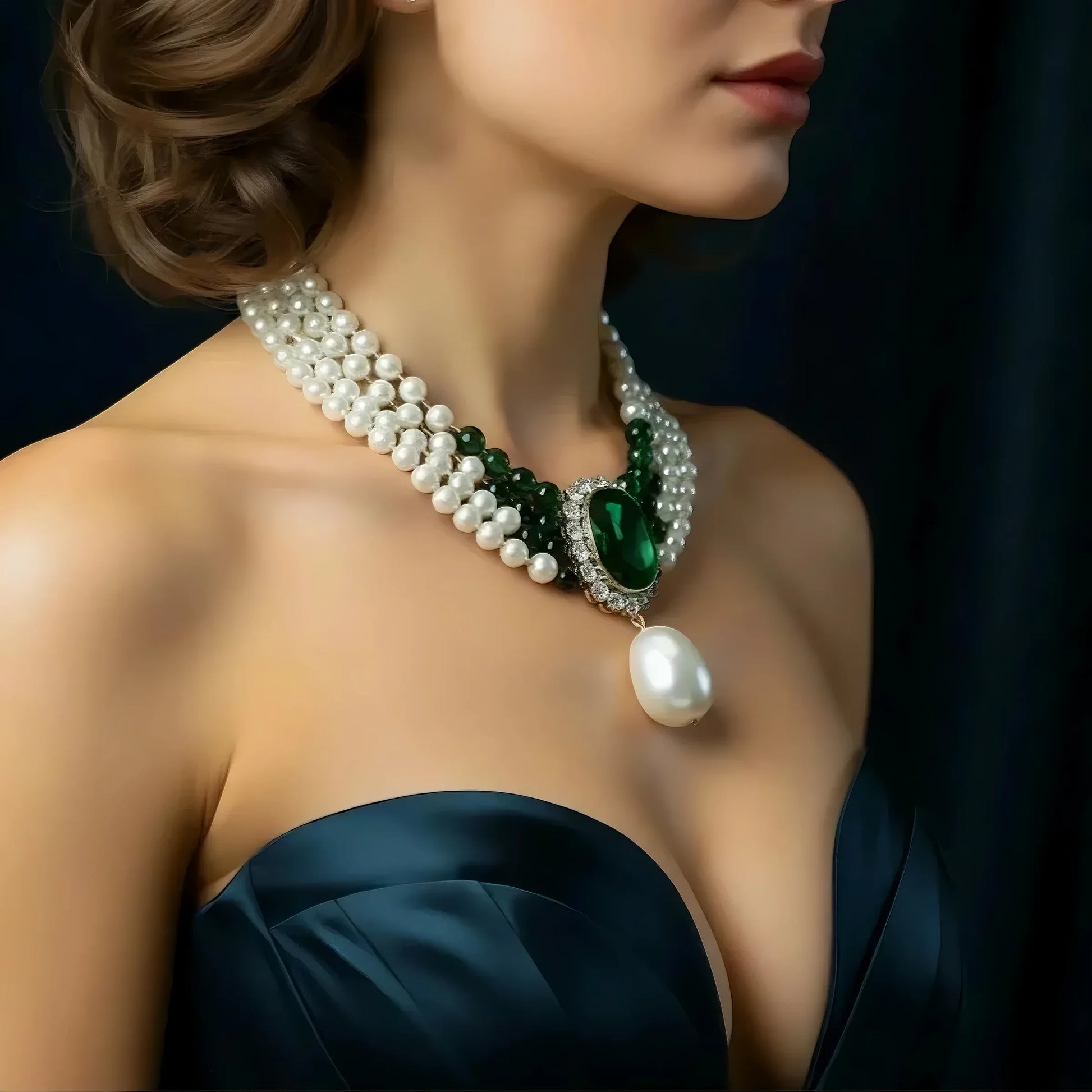 عندما تتحد الأنوثة والابداع في تصميم واحد، يكون هذا الطقم هو الاختيار الأمثل لكِ. تحفة فنية  تجمع بين اللؤلؤ الأبيض الفاخر مع حجر العقيق الأخضر الطبيعي النادر يتوسطه بروش من الكيوبك زيركونيا باللون الأخضر  مثيل الزمرد تحيطه حبات من ألماس الموزانايت أو من الزيركون شبيه الماس   (حسب اختيارك)
