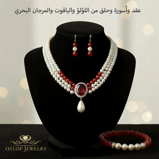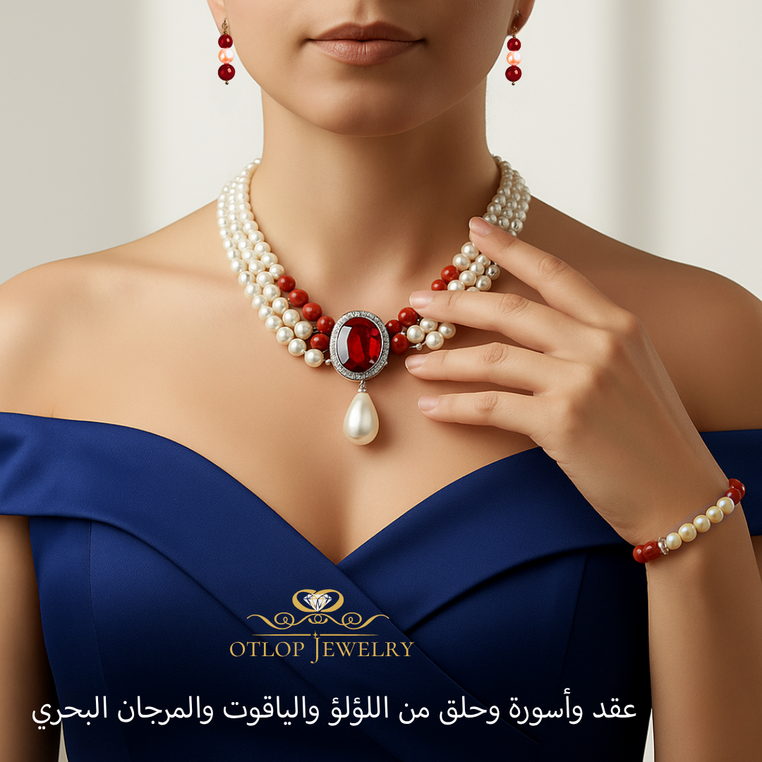 طقم كامل ثلاث قطع من اللؤلؤ الطبيعي الفاخر مع 20 قيراط من الياقوت الأصلي .. عندما تتحد الأنوثة والابداع في تصميم واحد، يكون هذا الطقم هو الاختيار الأمثل لكِ. تحفة فنية  تجمع بين اللؤلؤ الأبيض الفاخر مع المرجان البحري (اليسر) باللون الأحمر ويتوسطه بروش من الياقوت  الأصلي تحيطه حبات إما من الماس الموزانايت أو من الكيوبك زيركونيا شبيه الماس  . . (حسب اختيارك)