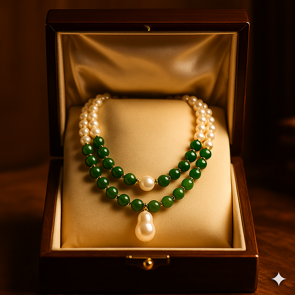 فمع اللؤلؤ الطبيعي بلونه وبريقه المعروف يأتي حجر الجاد النادر الطبيعي بلونه الأخضر ليضيف لمسه من الجمال النادر. وفي نهاية العقد تتدلى جوهره طبيعيه من لؤلؤ الباروك الضخم
