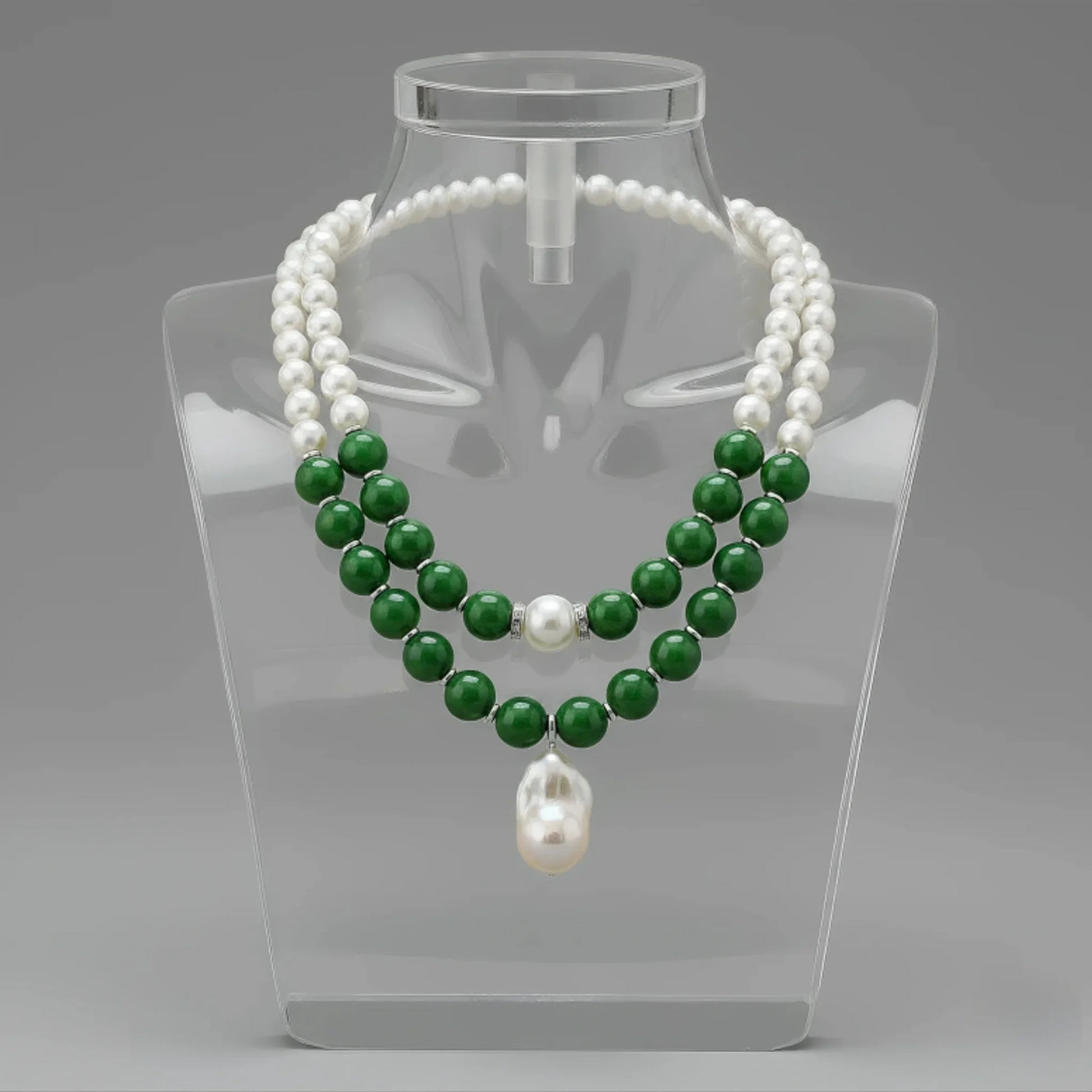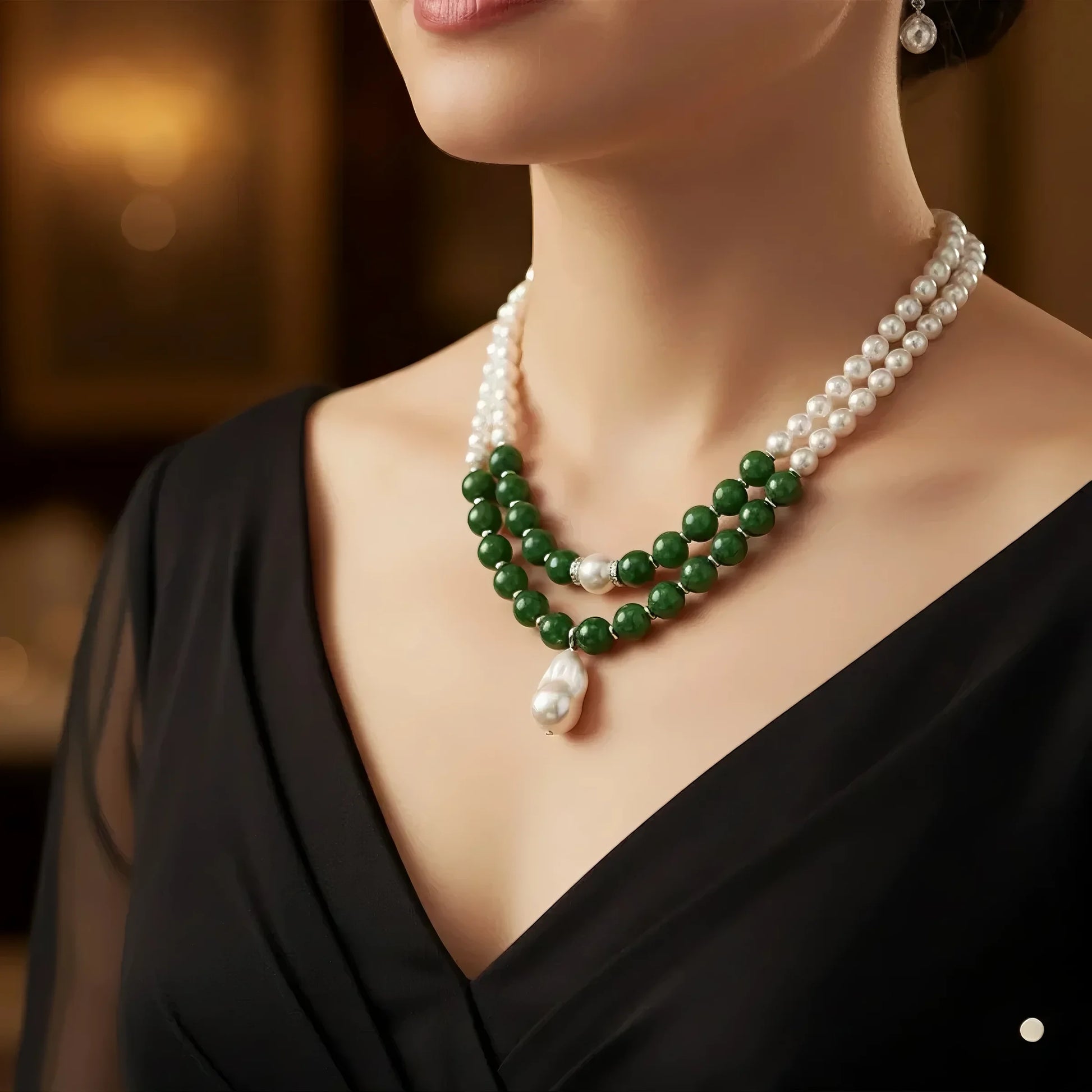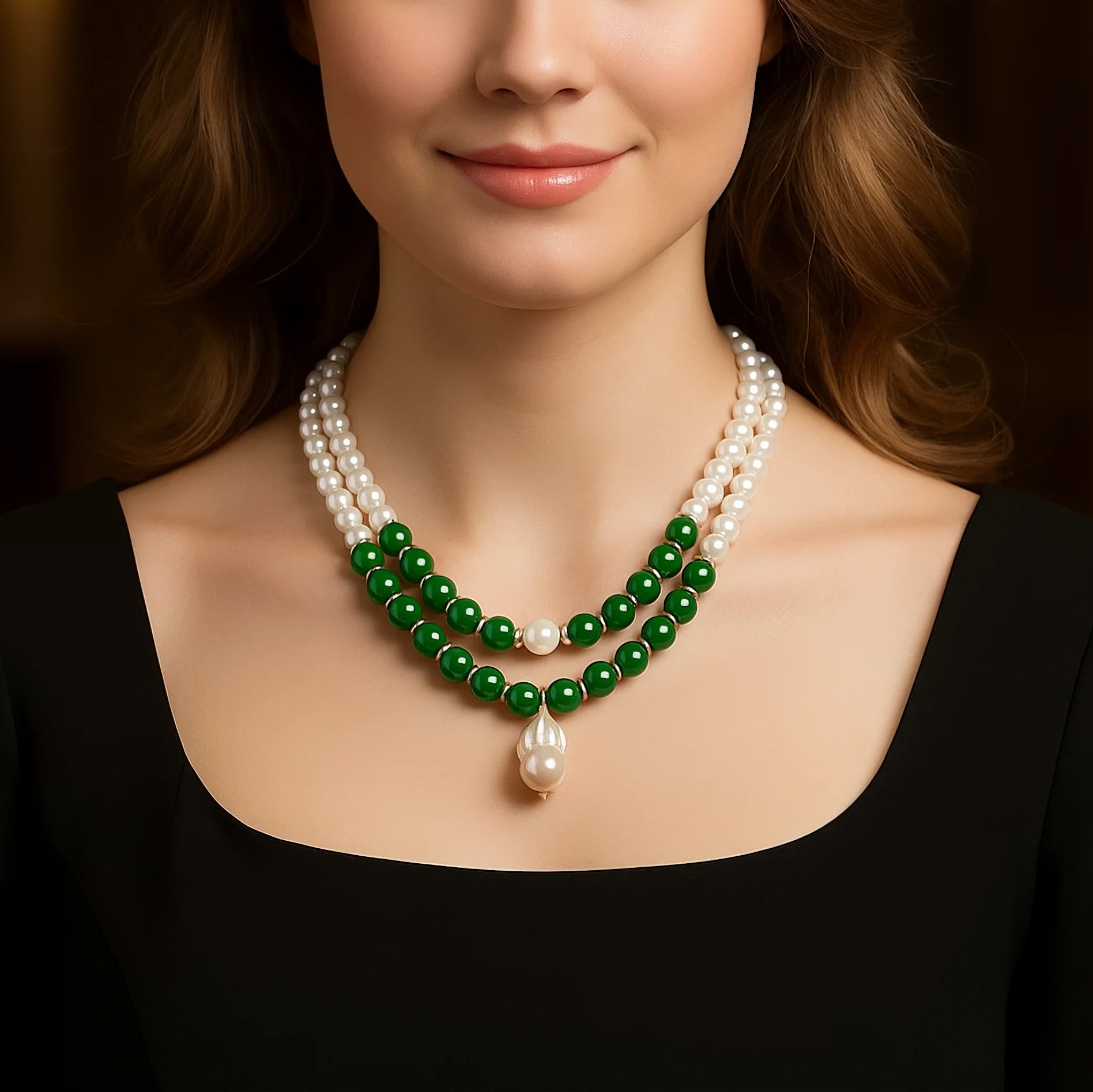 عقد مزدوج من اللؤلؤ الطبيعي وحجر الجاد الأخضر مع بروش من لؤلؤ الباروك النادر - كود 466 (Copy)