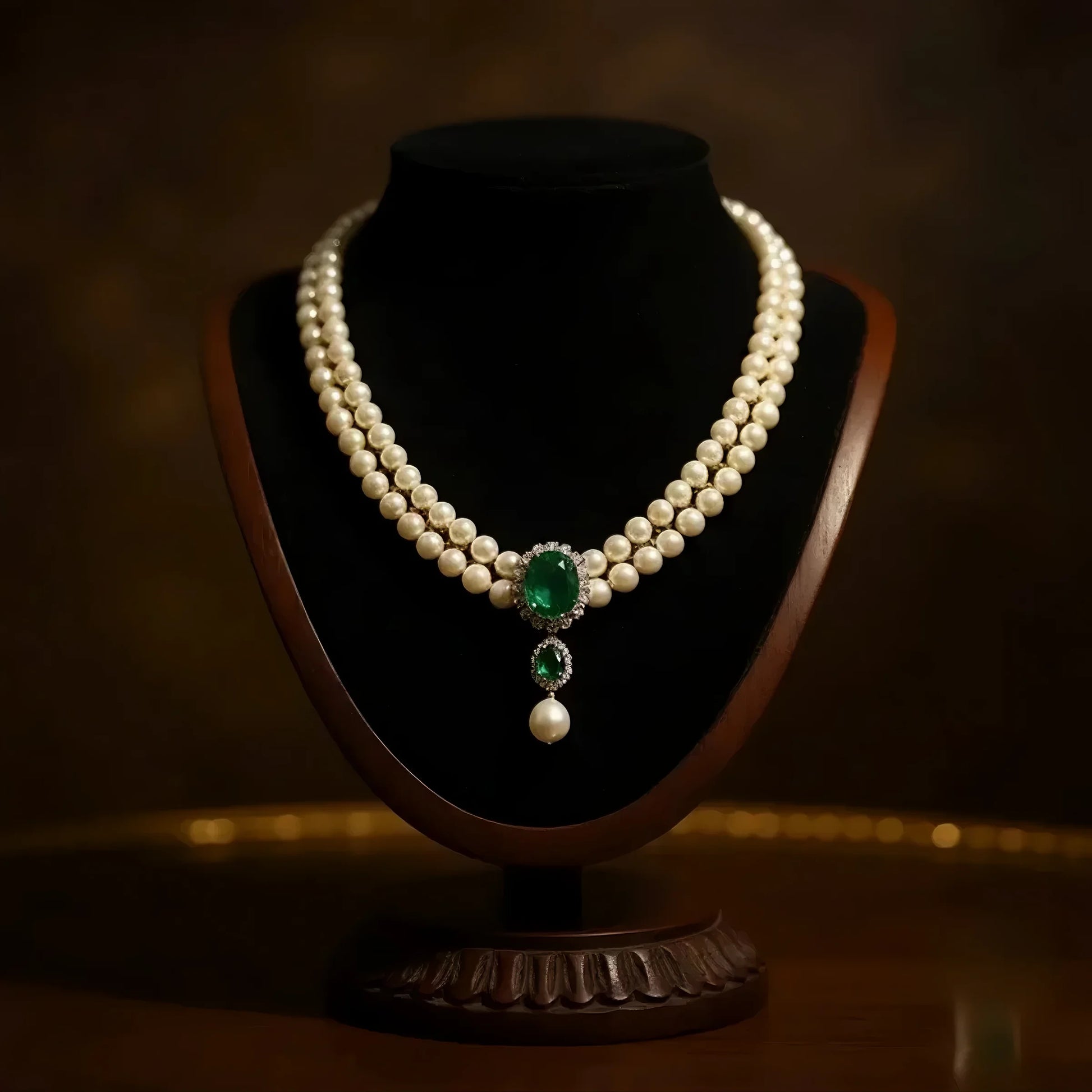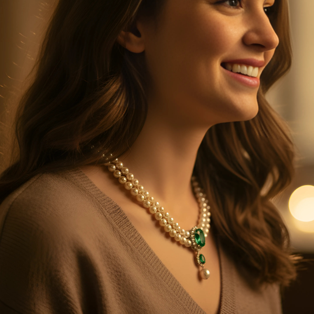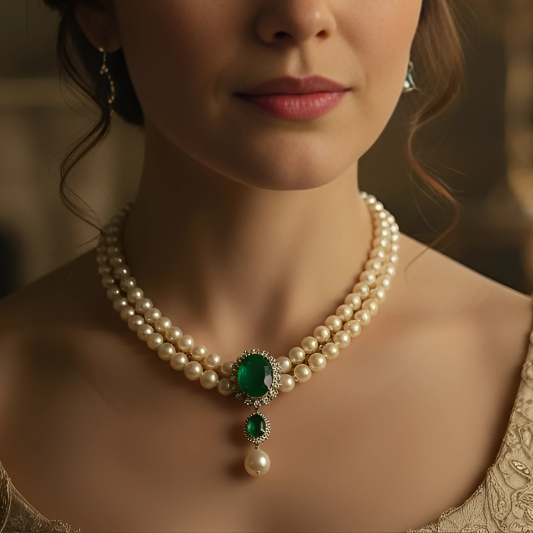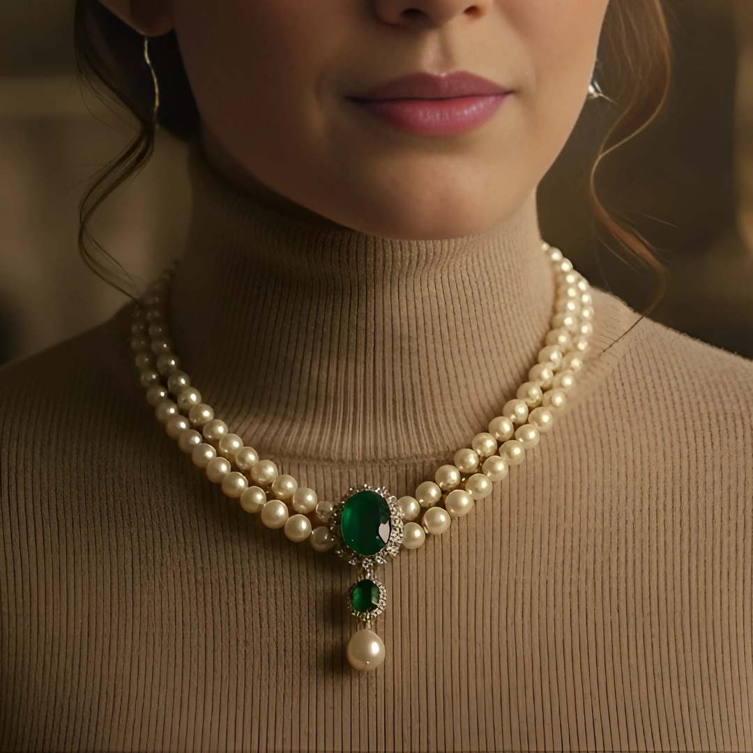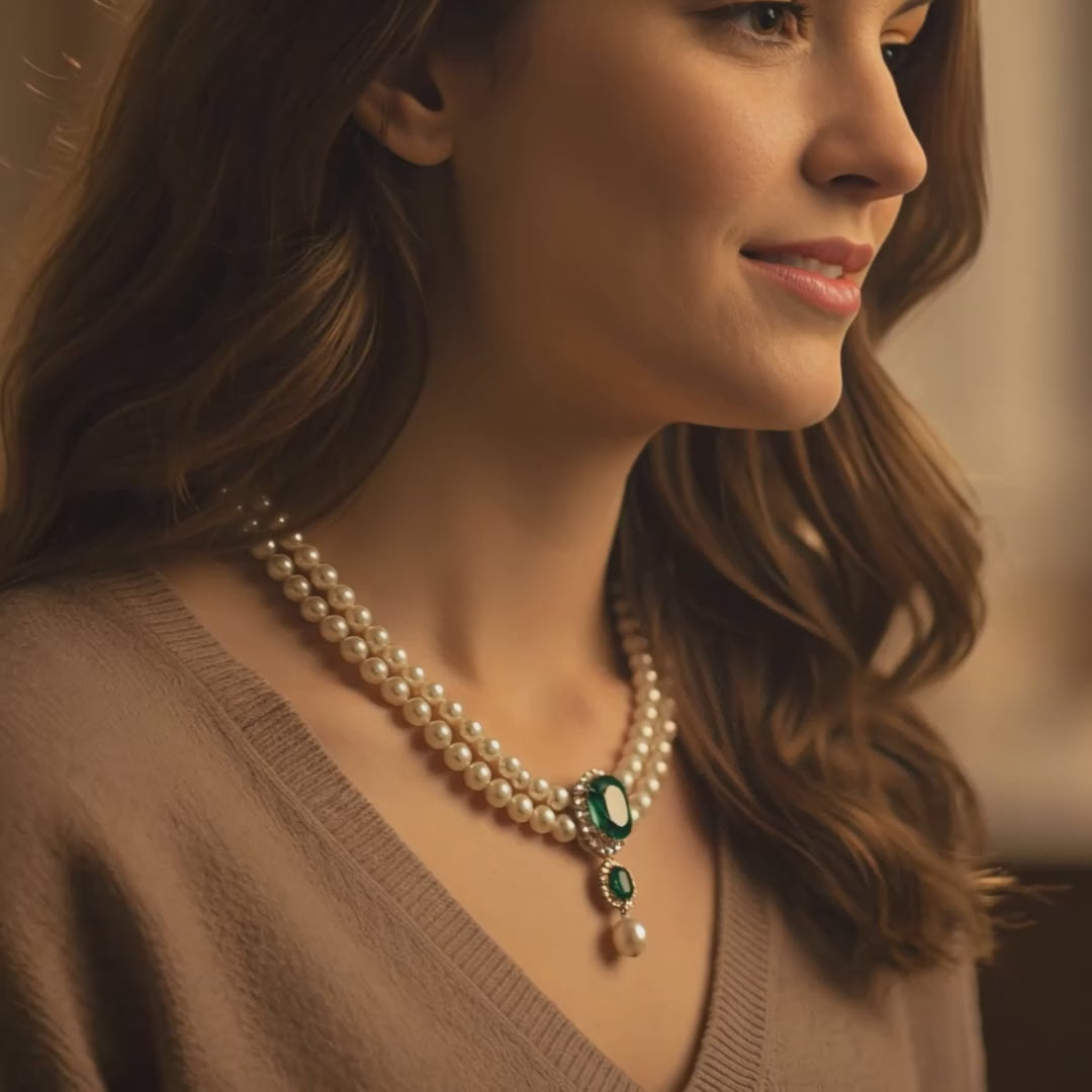 . تحفة فنية  تجمع بين اللؤلؤ الأبيض الفاخر مع الزمرد الأخضر . يحتوي العقد على بروش رئيسي يزن 20 قيراط من الكيوبك زيركونيا الخضراء مثيل الزمر الطبيعي.. ومحاط بحبات من ألماس الموزانايت أو الماس الحر  أو الكيوبك زيركونيا - حسب اختيارك -. وبروش أصغر منه بنفس الخامات ونفس التصميم. وفي نهاية العقد تتدلى منه حبه من اللؤلؤ الطبيعي مقاس 12 مل