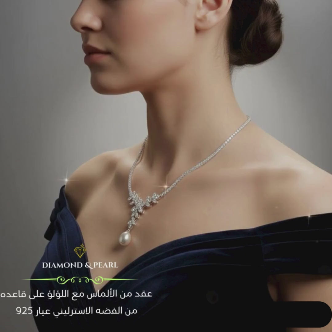 تحفة فنية تتضم أكثر من 5 قراريط من ألالماس مع سلسله مطعمه بالكامل بأكثر من 60 قطعه من الكيوبك زيركونيا على قاعده من الفضه عيار 925 المطليه بالبلاتين. وفي نهاية العقد تتدلى لؤلؤة طبيعية من أفخم وأرقى أنواع اللؤلؤ الطبيعي