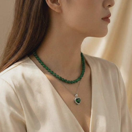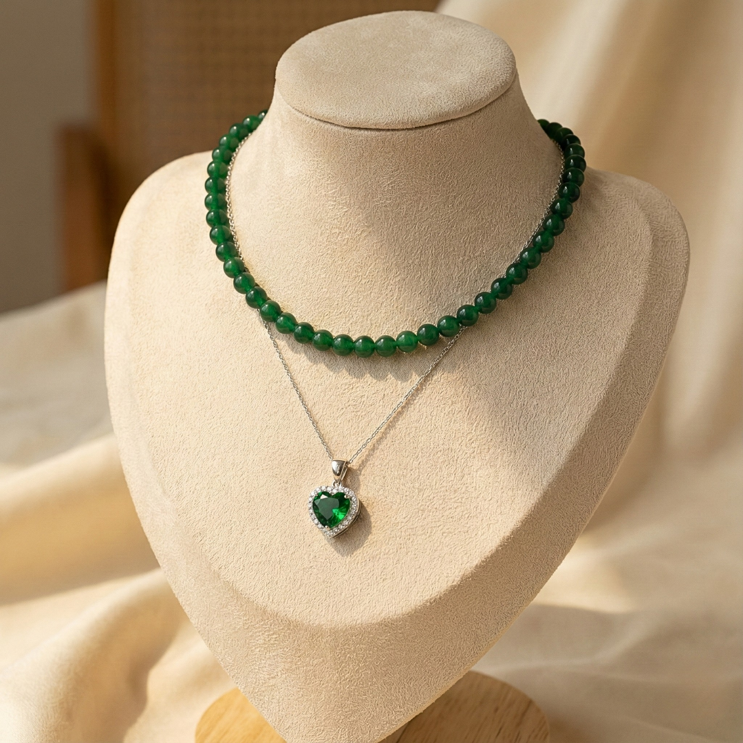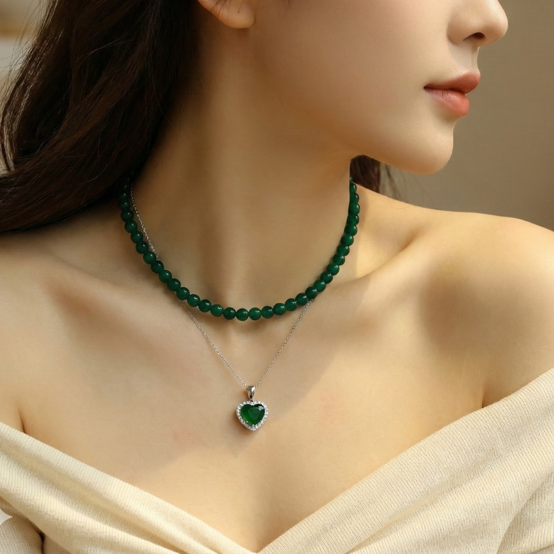 عقد طبقتين من حجر الجاد الاصلي مع الفضه والزمرد - كود 5320